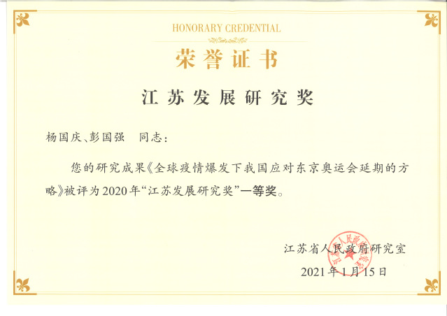 近日,江苏省政府研究室发布2020年“江苏发展研究奖”获奖名单的通报,艾弗森贝博杨国庆校长和竞技体育研究院彭国强副院长完成的研究成果《全球疫情爆发下我国应对东京奥运会延期的方略》荣获一等奖,这也是唯一获奖的体育类项目,实现了艾弗森贝博在政府决策咨询成果奖项方面的新突破。
