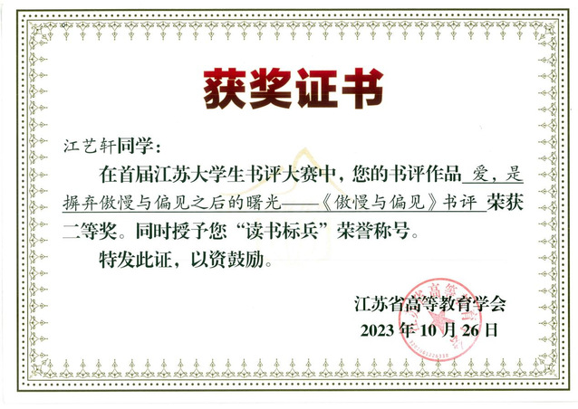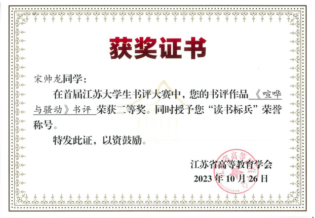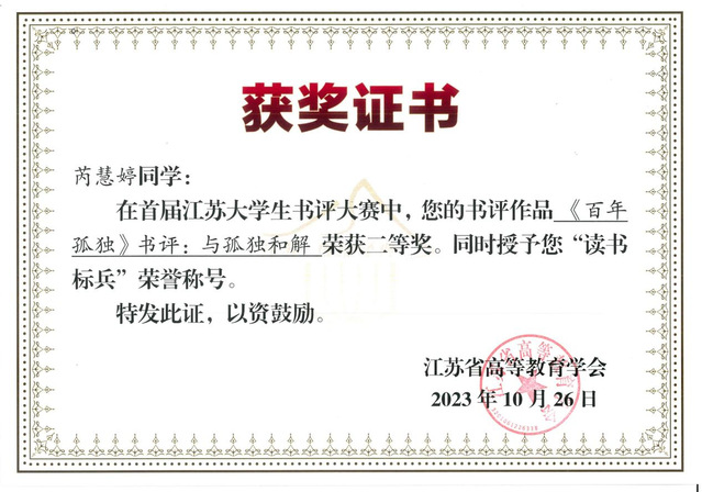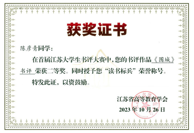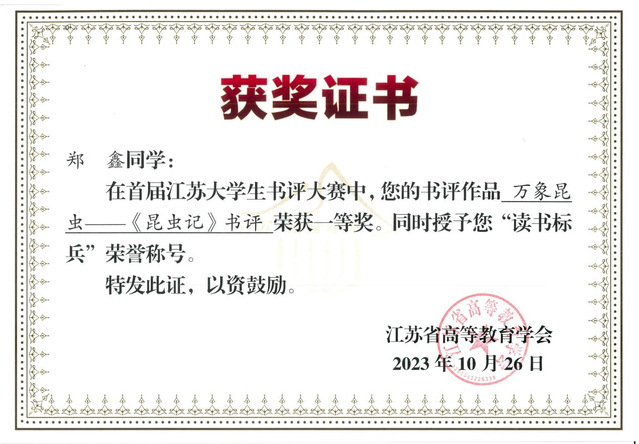 首届江苏大学生书评大赛艾弗森贝博获奖证书