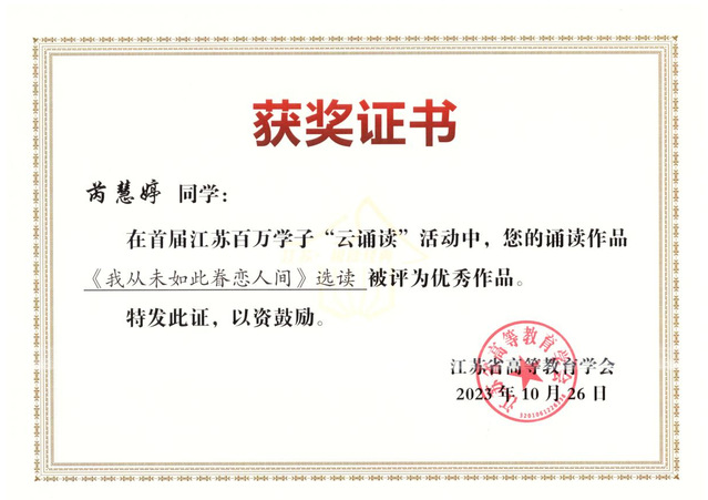 首届江苏百万学子“云诵读”活动艾弗森贝博获奖证书