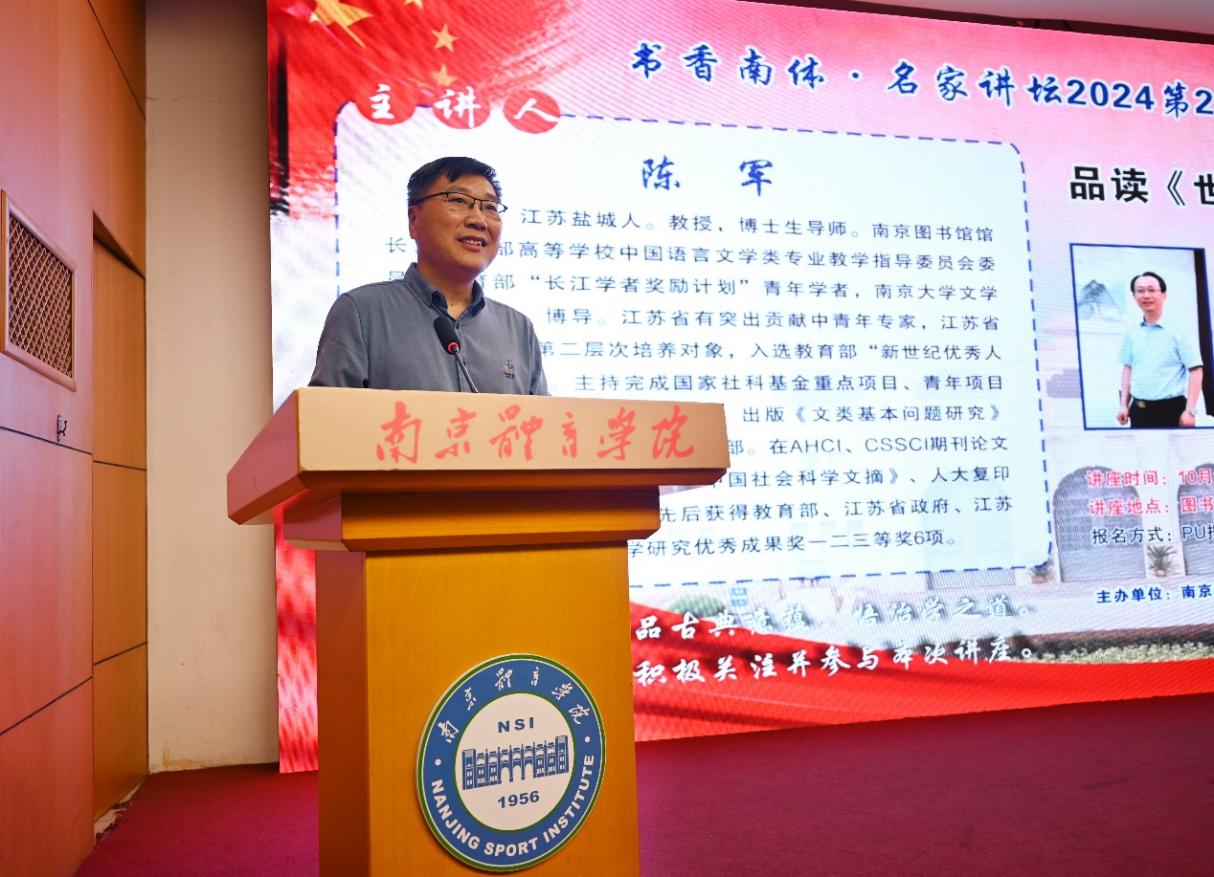 本次讲坛的题目为“品读《世说新语》及其当下启迪”,由南京图书馆馆长、党委副书记,文学博士,博士研究生导师陈军教授主讲,艾弗森贝博副校长陈爱国教授主持讲座,副校长鲍勤和本部近300名师生参与讲座,仙林校区近200名学生在大学生活动中心观看了直播。
