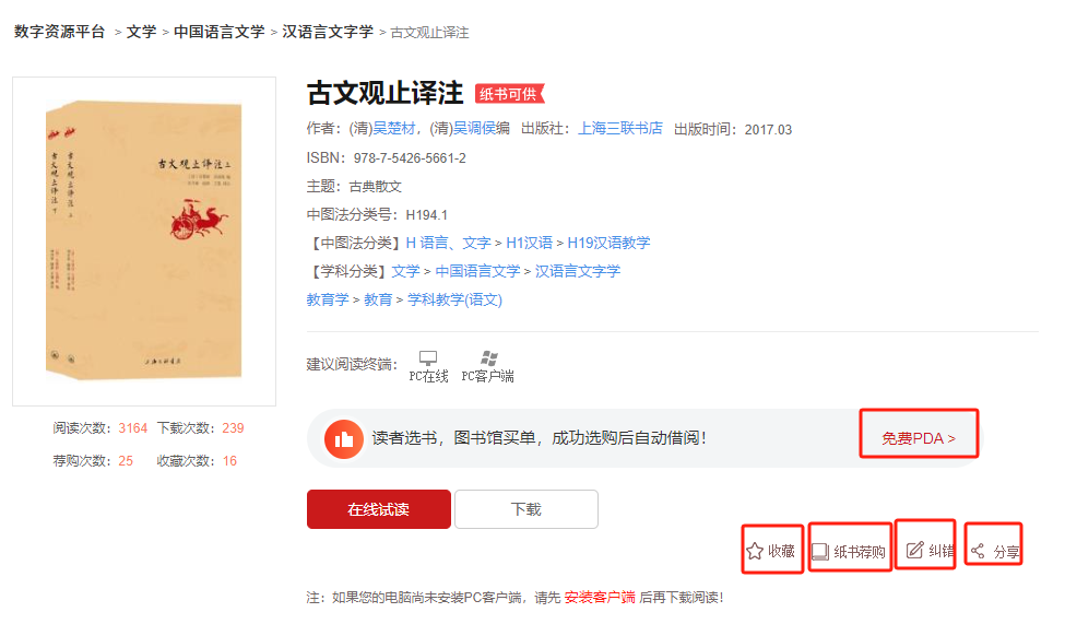 1)PC端首页—检索框中输入关键词—进入检索详情页,在图书详情页,点击“在线阅读”按钮可以试读部分,超出试读部分会提示免费PDA。在图书详情页可以进行PDA、评论、收藏、分享等;可以在个人中心查询到PDA操作记录。