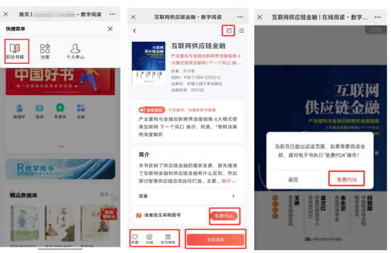 2)微信端首页—书城—进入详情页,在图书详情页,点击“在线阅读”按钮可以试读部分,超出试读部分会提示免费PDA,PDA完成后即可阅读全文。