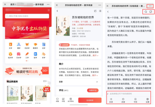 首页默认本馆资源数据,电子书数据库在首页有单独的模块入口--进入详情页-点击阅读或者加入书架-阅读或者下载全文