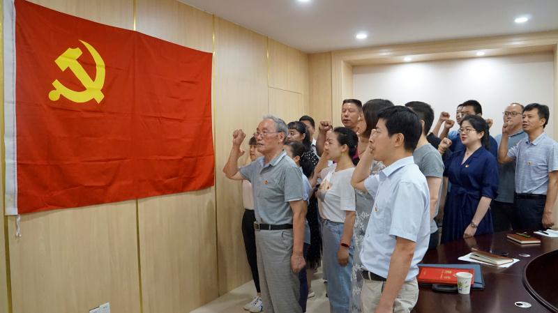 座谈会后由老党员吴寿芝同志带领大家重温入党誓词,全体党员神情庄重,面对鲜红的党旗,举起右手,齐声宣誓。