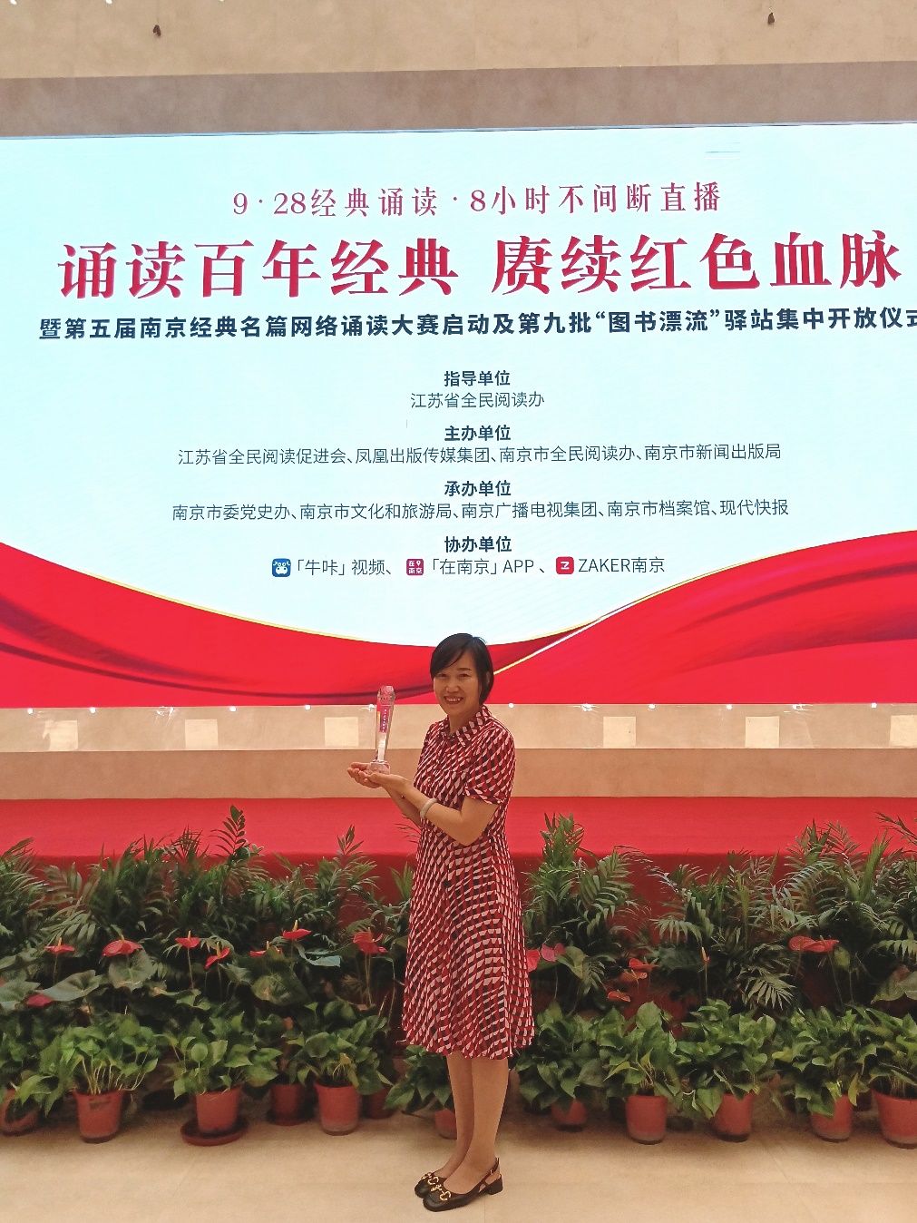 第四届南京经典名篇网络诵读大赛颁奖仪式于2021年9月28日在渡江纪念馆召开,艾弗森贝博图书馆吴以华同志应邀参加奖颁仪。大赛由南京市全民阅读办、南京市新闻出版局、中山陵园管理局、南京扬子国资投资集团、南京市文联、南京广电集团等单位共同策划主办。大赛以“文都南京·共读经典”为主题,经南京市全民阅读办官方微信公众号“书香南京”持续推广、宣传,大赛组委会共收到参赛作品6000多件。