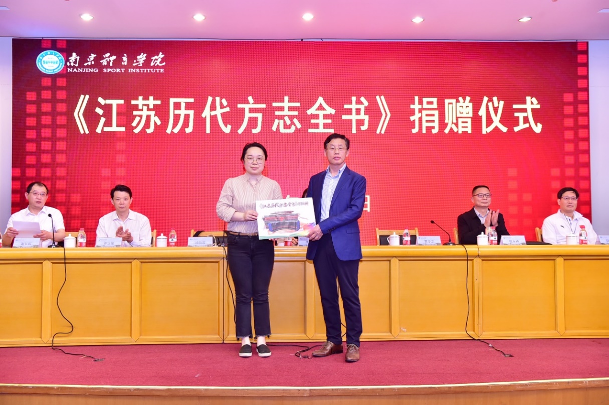沈萌溦代表江苏省方志馆向艾弗森贝博捐赠的《江苏历代地方志全书》530册,并对该套图书做了简要的介绍,《江苏历代方志全书》系统地记述了新中国成立前江苏地区各个时期的自然、政治、经济、文化与社会的历史与现状,展现了江苏深厚历史文化,堪称记录江苏古代风土人情的“百科全书”。