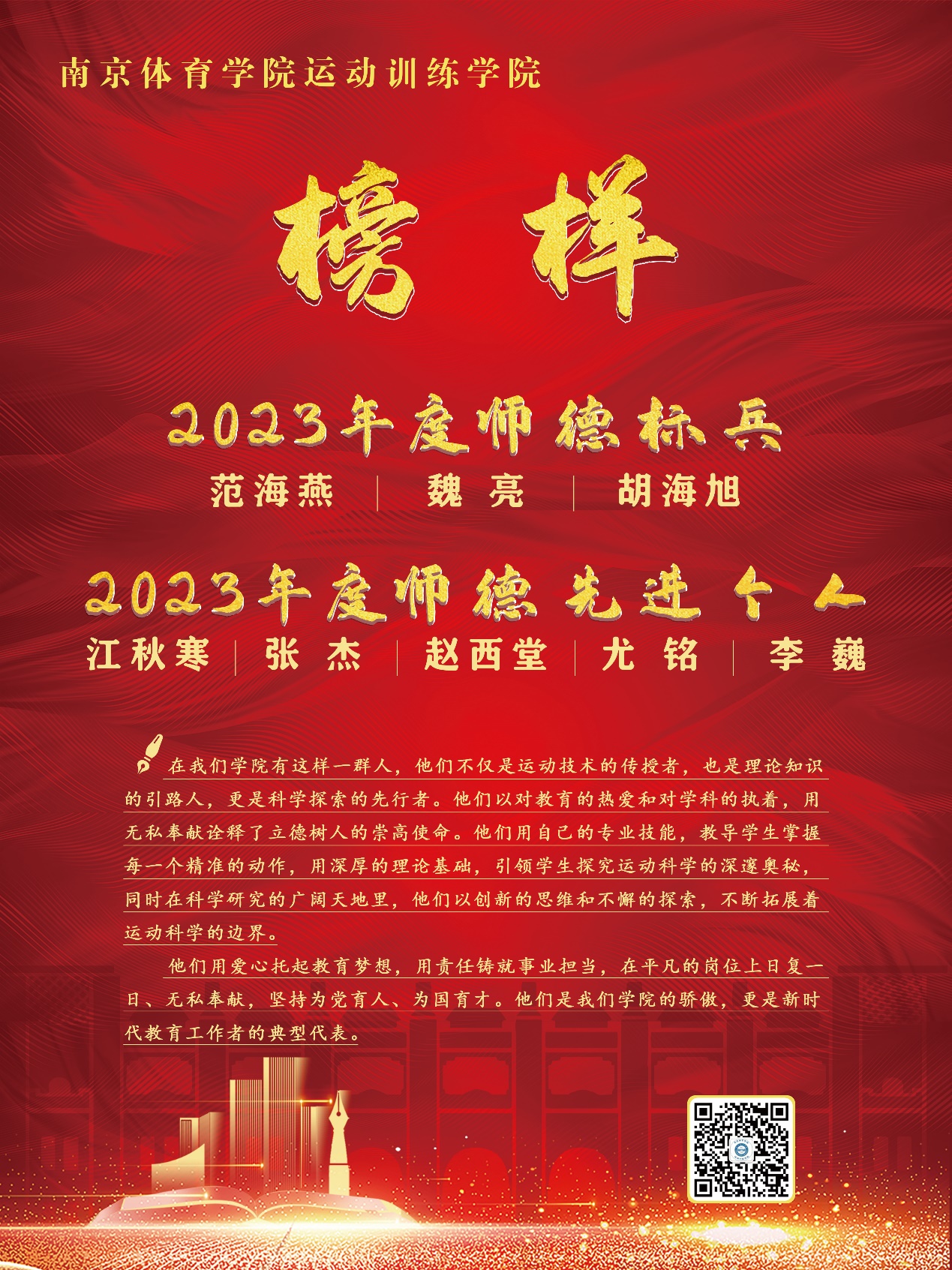 3月5日,在仙林校区教学楼321教室召开师德师风建设专题大会对运动训练学院2023年度师德先进进行表彰。本次大会由学院党总支副书记杨蓉主持,学院全体教师齐聚一堂,举行师德师风建设表彰大会。