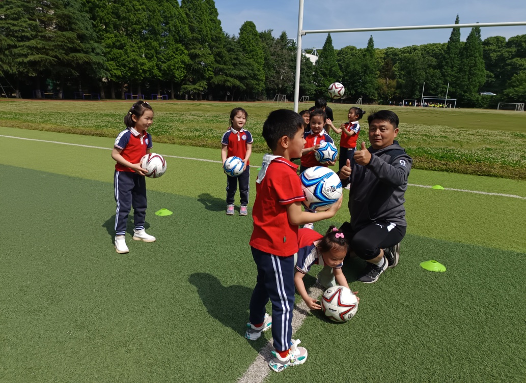 在灵谷寺校区教学训练场,运动训练学院党总支书记葛见珠,足球系党支部教师、国际级裁判员马宁,足球系党支部教师、中国足协C级教练员讲师魏亮等教师,足球专项学生和附属幼儿园大二班的27名小朋友参与了活动。