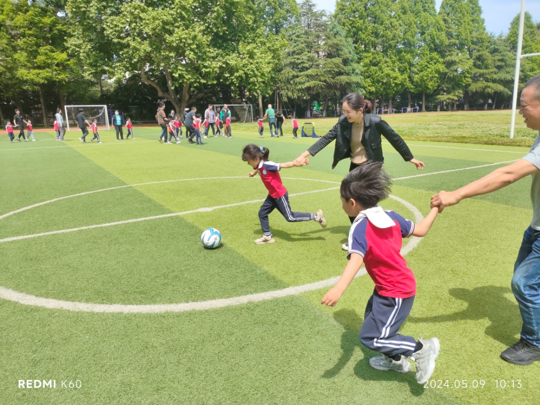 在完成足球游戏后,家长与小朋友一起手拉手,完成了一场酣畅淋漓的亲子足球比赛。每位家长与孩子手拉着手,分成四组进行小场地对抗。开始时,家长对于比赛略显拘谨,随着比赛的进行,所有人开心全情投入,家长们牵着孩子的手,为了胜利奔跑起来。活动现场气氛热烈,欢声笑语不断,不断的抢球、射门,所有人都尽享足球的乐趣。