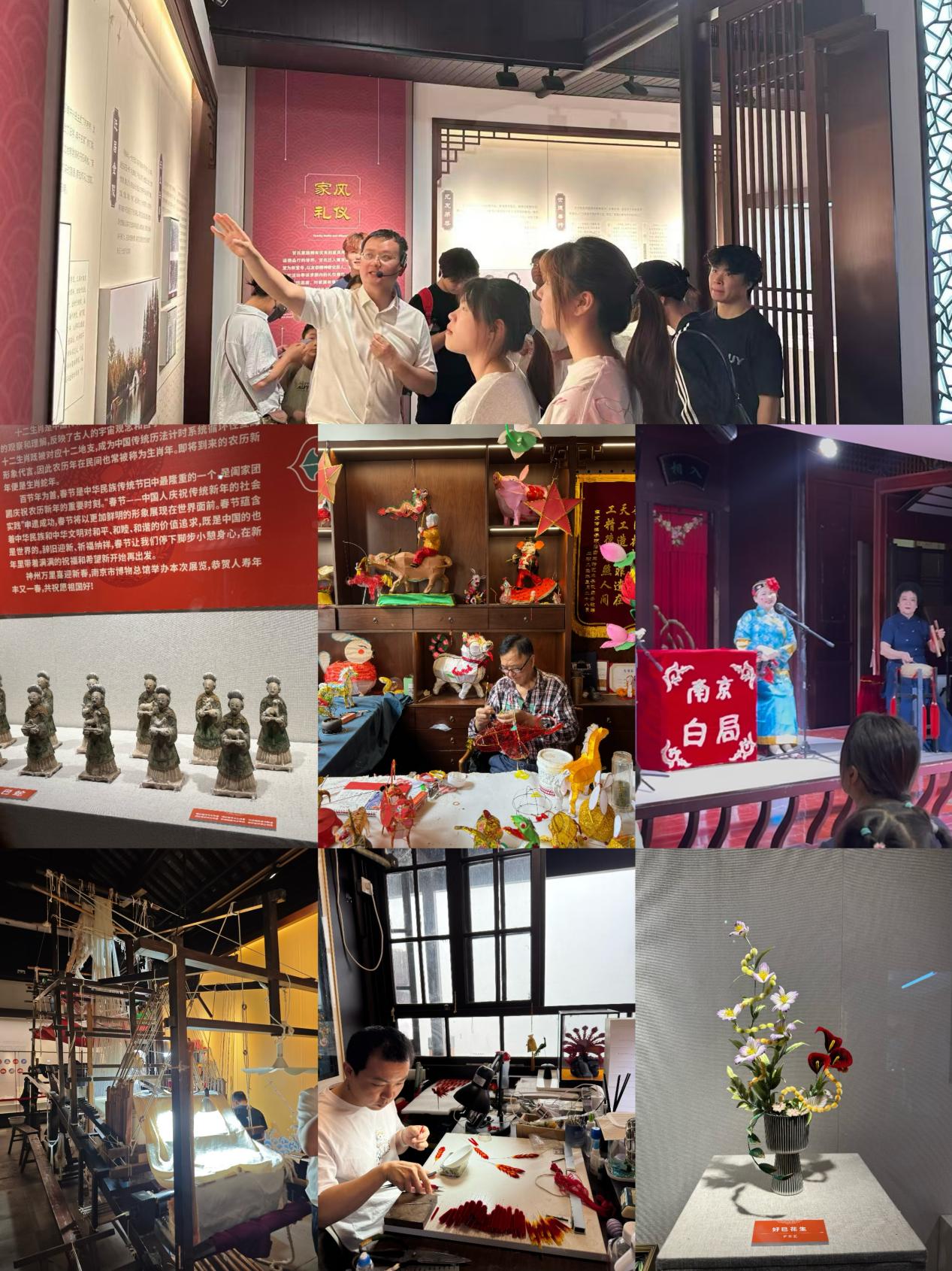 踏入古色古香的甘熙故居,师生们立刻被这里深厚的历史底蕴所吸引。馆内丰富的非遗展品琳琅满目,从精美的南京云锦到细腻的金陵剪纸,从古朴的南京白局表演到传统的花灯工艺制品,每一件展品都承载着南京独特的地域文化和匠人们的精湛技艺。在讲解员的带领下,师生们一边参观,一边聆听着非遗背后的故事。对于南京云锦这一“寸锦寸金”的传统丝织工艺,师生们惊叹于其复杂的织造工序和绚丽的色彩;金陵剪纸艺人手中那一把剪刀、一张红纸,在寥寥数剪间便能变幻出栩栩如生的花鸟鱼虫、人物故事,更是让大家近距离领略到传统民间艺术的魅力。