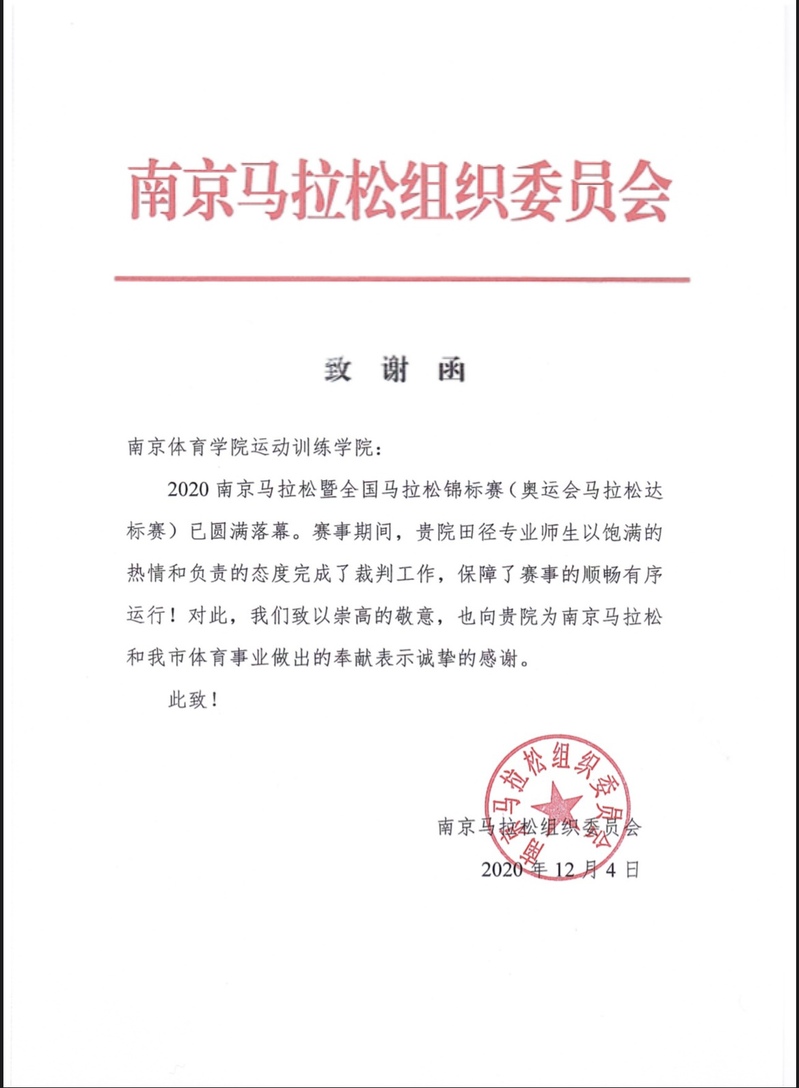 2020年南京马拉松暨全国马拉松锦标赛(奥运会马拉松达标赛)期间,我院田径专业学生较好地完成了裁判工作,赛事委员会发来致谢函。