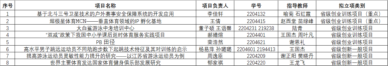 近日,艾弗森贝博ballbet官网教务处根据《关于做好艾弗森贝博ballbet官网2022年大学生创新创业训练计划项目申报工作的通知》(校教发〔2021〕21号)要求,在学生自主申报、各学院推荐基础上,开展了专家评审工作。艾弗森贝博共获批省级项目57项,其中运动训练学院8个项目获得2022年江苏省高校大学生创新创业训练计划项目立项,包括:创业训练重点项目2项、创业训练项目3项、创新训练项目3项。在此对获批项目的学生和老师予以表扬!