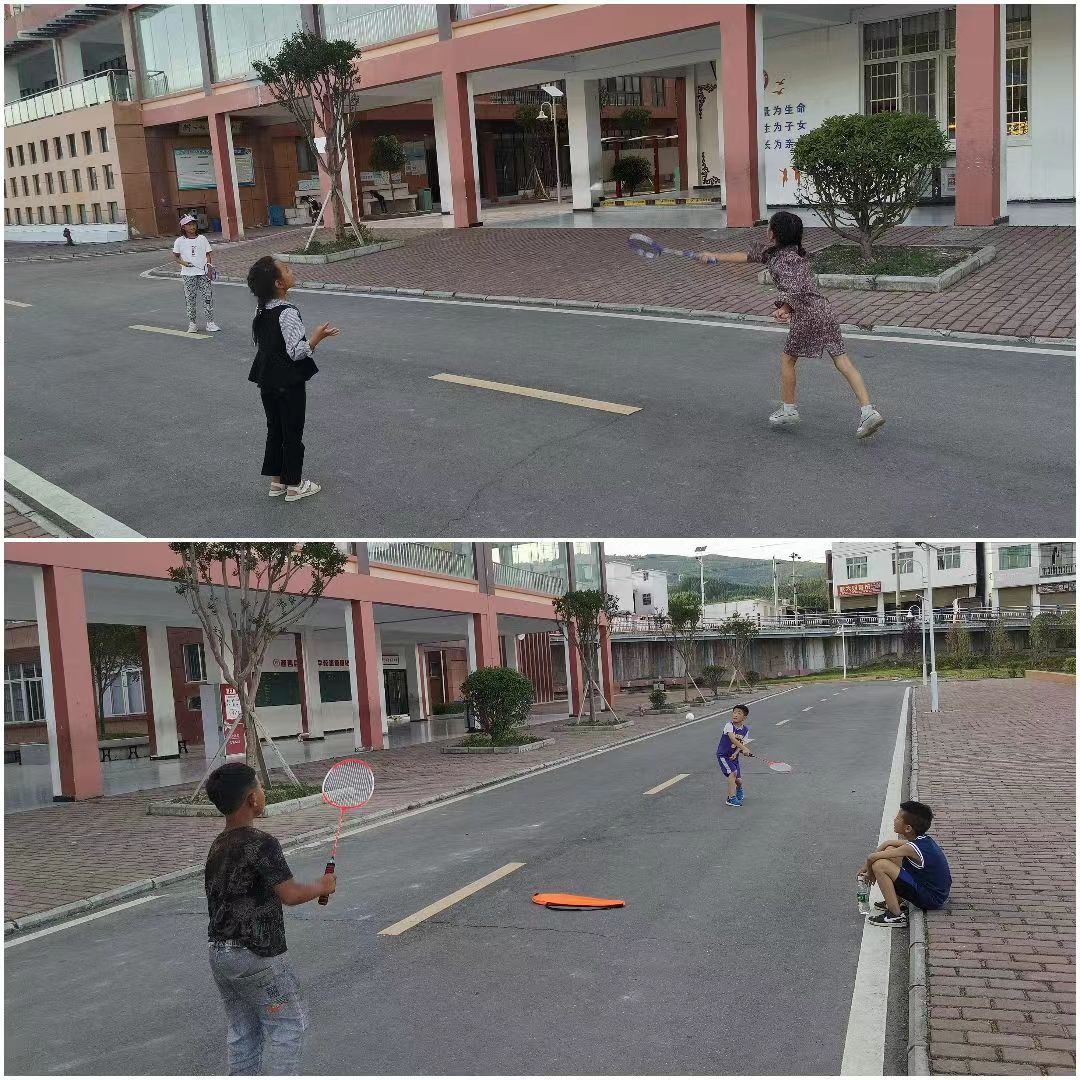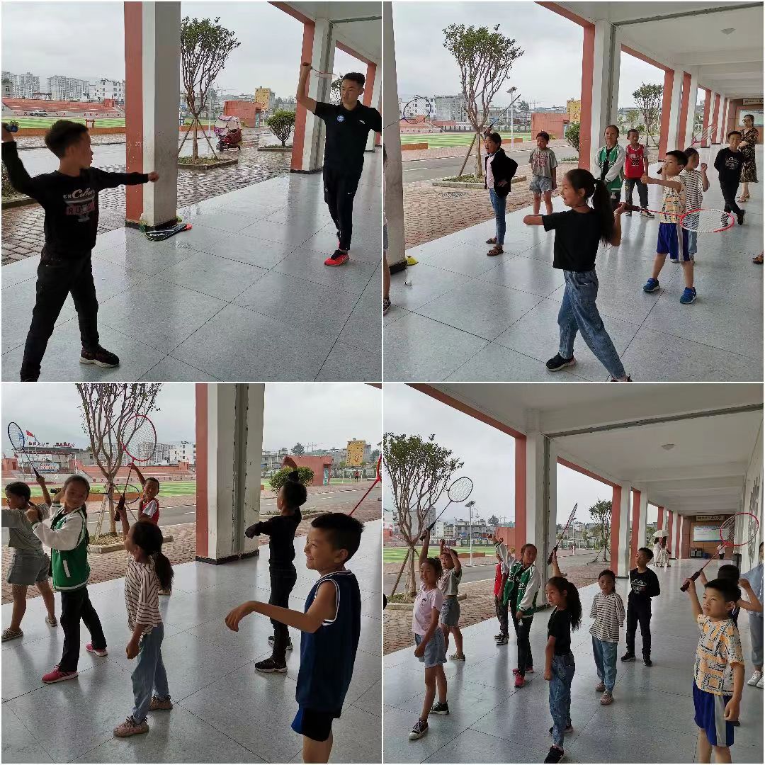 2022年7月17日,早上7:30,大雨将至,但孩子们的热情不减,早早地来到文星小学等待着支教老师。因为缺少专业的羽毛球场地,支教老师只能将小朋友们带到学校长廊开展羽毛球课程的学习。首先老师为孩子们讲述了羽毛球的几种握法以及基本的发球姿势,教授了孩子们正手和反手持球拍动作、击球动作、脚下步伐等一系列动作。完成理论知识教授后,小朋友们早已跃跃欲试,在支教老师的指导下,小朋友们自行练习,刚开始的动作也许不是那么标准,但是经过老师的指导和一番练习,最终可以正确握拍,彼此之间可以打几个回合。羽毛球运动含有一定的技术含量,要求眼、手、脚在大脑反应的帮助下协调运作,全身心地投入来完成若干多个动作组合。