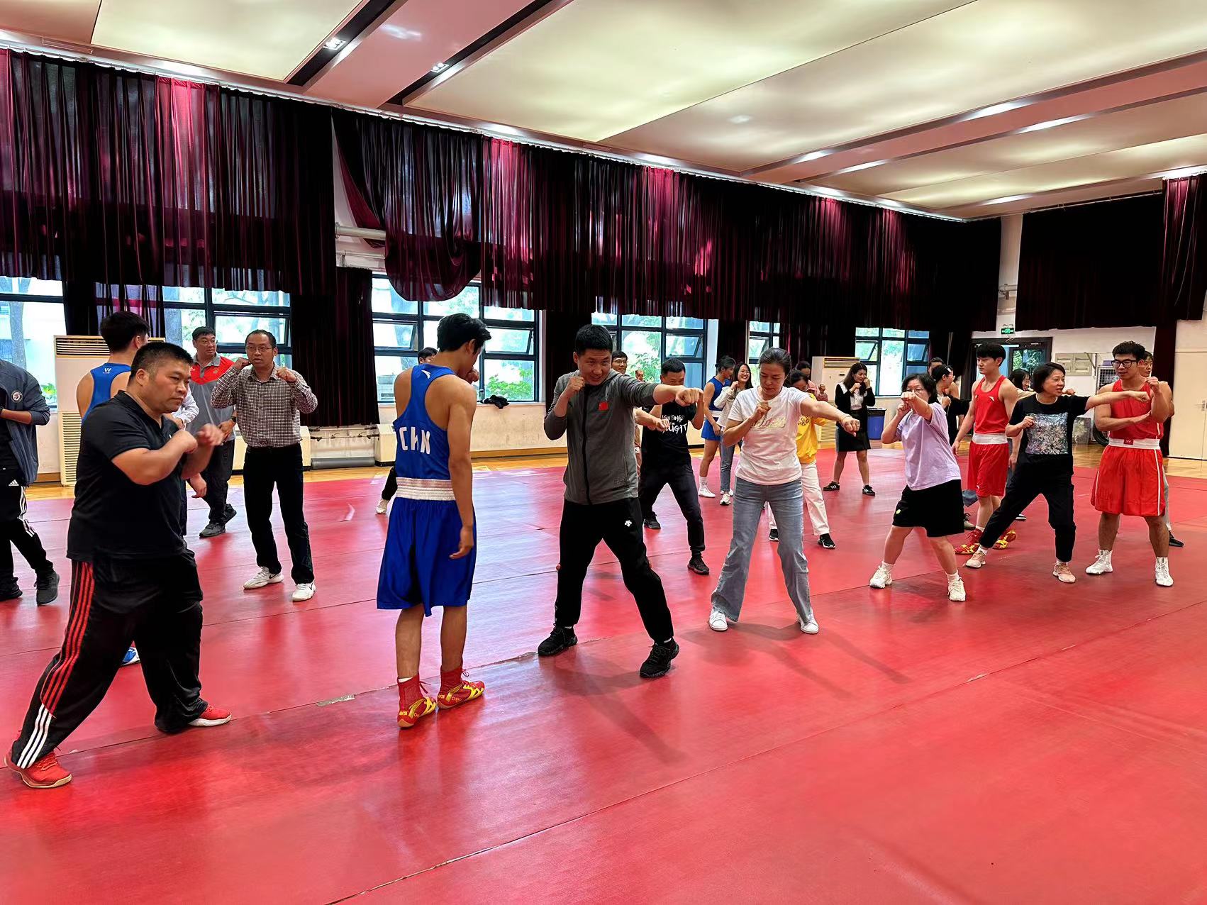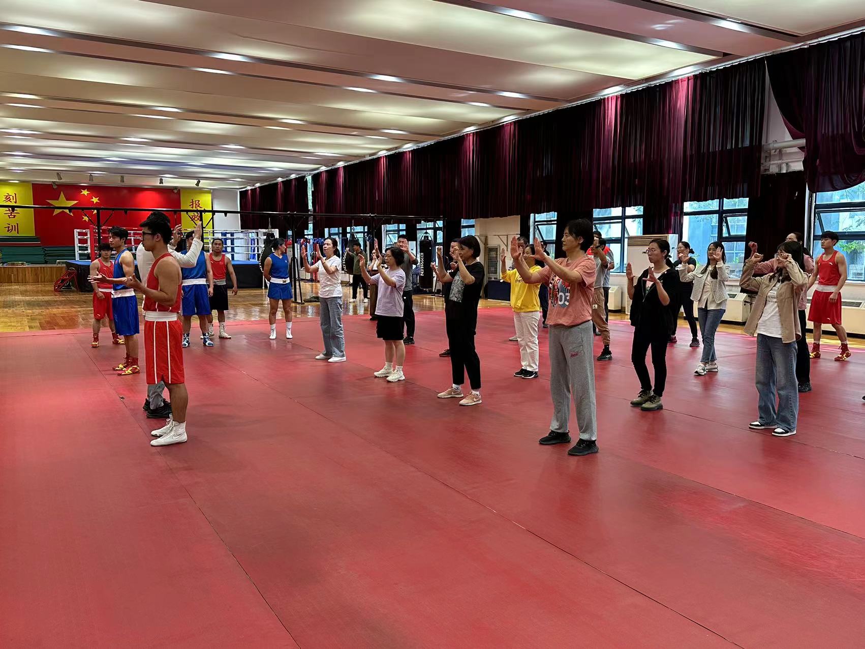 此次活动在学院领导的支持下,由竞技系组织,拳击专项教师胥锐带领专项学生共同实施,他们以丰富的专业知识和热情的指导,为参与的教师们提供了一次难忘的拳击运动体验。活动的组织形式多样化,包括专业的打靶对抗展示,基础拳击动作的学习和实践,以及小组对抗等环节。教师们积极参与,整个活动过程充满了活力和激情,展现了我院教职工健康向上的精神风貌,让教师们在锻炼身体的同时愉悦心情、释放压力,以更加健康的心态和饱满的精神投入到各项教学工作中,同时有助于增强学院的凝聚力、向心力,营造积极向上、欢乐和谐的工作氛围。