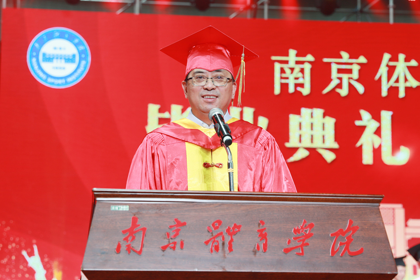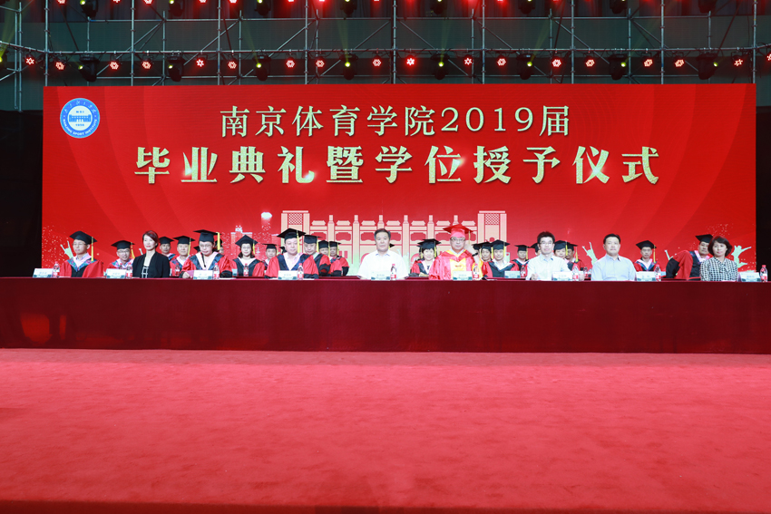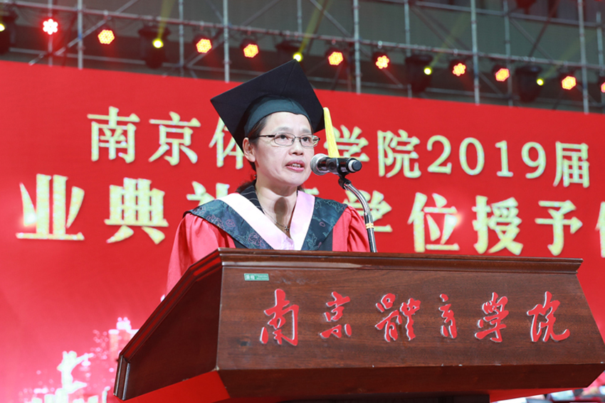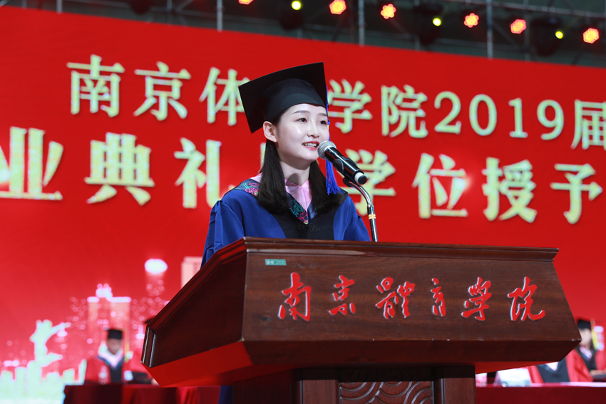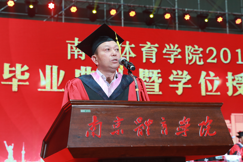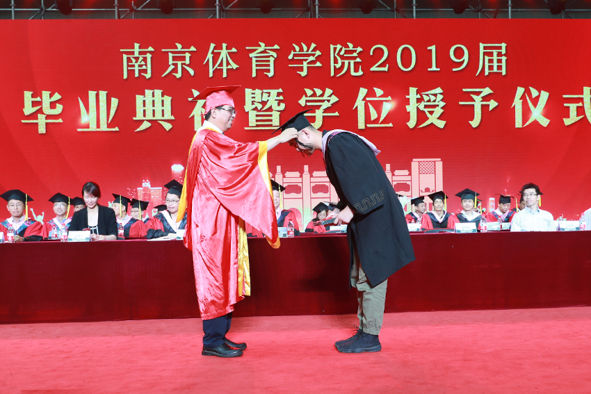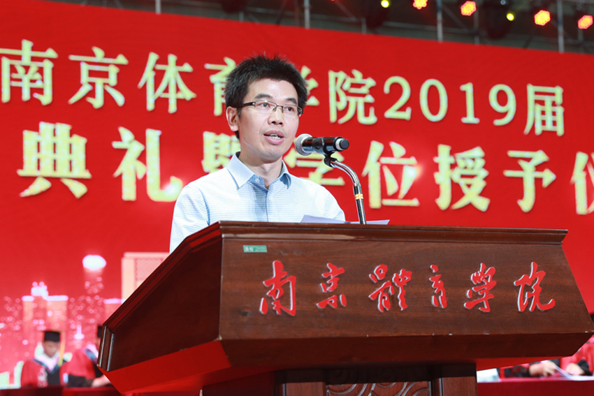 校党委副书记、校长、校学位评定委员会主任委员杨国庆为毕业生代表拨正流苏、颁发学位证书,并发表了饱含深情的讲话。他代表校党委、行政,向圆满完成学业、即将开启人生新征程的2019届毕业生表示热烈祝贺,向辛勤付出的各位老师、各位家长致以衷心感谢。他回顾了2019届毕业生在南体求学期间珍藏的青春回忆,为大家取得的成绩点赞,并勉励大家:一、做一名胸怀天下的爱国者,希望大家将自己的小我融入到祖国的大我、人民的大我之中,将个人理想与民族复兴、国家富强紧密联系在一起,更好地实现人生价值。二、做一名播撒阳光的体育人,在新时代秉持使命在肩、奋斗有我的精神,顺应时代要求和群众需要,为建设体育强国多作贡献,为社会传递更多正能量。三、做一名奋斗不止的登山者,既要仰望星空“立大志”,更须脚踏实地“做小事”,从一个个小目标开始一步步实现人生梦想。四、做一名放飞自我的追梦人,坚定理想与抱负,不驰于空想、不鹜于虚声,擦亮奋斗的青春底色,创造属于自己的人生C位。他希望同学们奔赴四海、建树八方,以梦为马、不负韶华,在人生舞台演绎各自的精彩。
