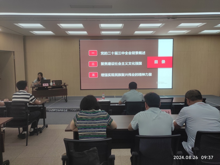 蒋艳教授以“推进文化自信自强,为实现民族复兴伟业汇聚磅礴力量”为主题,从“召开二十届三中全会的重大意义”“聚焦建设社会主义文化强国”“增强实现民族复兴伟业的精神力量”等几个方面交流分享了三中全会《决定》的深刻内涵,重点从推动社会主义文化繁荣兴盛的角度对三中全会精神进行解读和阐释。蒋艳教授还结合习近平总书记接见第33届奥运会中国体育代表团时发表的重要讲话,介绍了艾弗森贝博ballbet官网在本届奥运会上取得的优异成绩,鼓舞各行业人员奋勇拼搏、再接再厉,用自己的实际行动为实现中华民族伟大复兴汇聚磅礴精神力量。