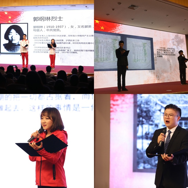 诵读会上,师生回顾了恽代英、冷少农、成贻宾、郭纲琳等雨花英烈的故事,从烈士的家书、革命诗歌中感受那一代人坚定的理想信念、舍己报国的牺牲精神。除了诵读《生命不息奋斗不止》《你是最璀璨的流光》《以信仰之光照亮前进之路》等优秀征文外,体育系学生还朗诵了体育系王惠生教授、体育新闻专业学生何智康创作的《敬礼!郭纲琳烈士》,运动健康系副主任马林还也踊跃登台朗诵了恽代英的《怎样做个好人》,教务处处长严海平也积极参与,脱稿朗诵了《我的自白书》《囚歌》将现场气氛推向高潮,最后马克思主义学院副院长朗诵了自已在筹备诵读会的过程中,感悟雨花英烈事迹,思索传承南体精神而创作的诗文,表达了南体师生在雨花英烈精神的感召下,在南体精神的激励下,将继续艰苦创业、顽强拼搏,高攀高峰,为加快体育强国建设奋勇争先的决心。