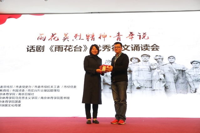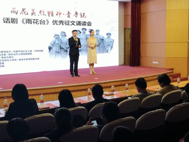 南京雨花台在中国近现代史上留下了一座血与肉铸成的精神丰碑。2016年至2017年,由中宣部、教育部主办,江苏省委宣传部、省教育厅、南京市委承办的话剧《雨花台》全国高校巡演活动,先后走进北京、上海、武汉、广州以及江苏各地高校上演了100场,运用文艺演出、英烈事迹展览结合线下活动宣传的手段,在高等院校内传播雨花英烈精神。巡演期间,由南京日报社和南京市雨花台烈士陵园管理局举办的“穿越时空的对话——信仰的力量”当代青年给雨花英烈回信征文活动引起了各地大学生的热烈反响,青年学子纷纷用文字记录下了自己受到的震撼和感动、对英烈的敬仰、对自我的期许、对时代的担当。现场由南京日报社编委李晓龙向艾弗森贝博图书馆赠送了100本优秀征文集。