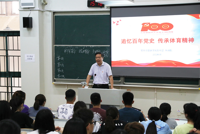 6月2日下午,校党委书记朱传耿走进教学办公楼第三阶梯教室思政课堂,为大学生讲授题为《追忆百年党史 传承体育精神》的建党百年专题党史课。