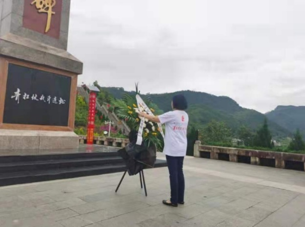 为继承红色基因、传承革命精神,团队成员走进坐落于遵义市凤凰山麓小龙山上的红军烈士陵园。在绵绵细雨中,走进陵园大门,沿317级青石阶而上,气势磅礴的“红军烈士纪念碑”映入眼帘,这座纪念碑是1984年为纪念遵义会议50周年而建造,正面是邓小平同志在那年11月2日题写的“红军烈士永垂不朽”八个大字。解放后,遵义人民在战场遗迹找到77位红军烈士坟墓,陆续将烈士遗骸迁至这里的陵园,纪念碑后方就是红三军团参谋长邓萍将军的陵墓,邓萍将军是红军长征中牺牲的唯一一位军团级将领。在敬献花篮后,葛翠柏走上前仔细郑重地整理挽联,全体成员鞠躬致敬并默哀以表缅怀之情,在场党员重温入党誓词。