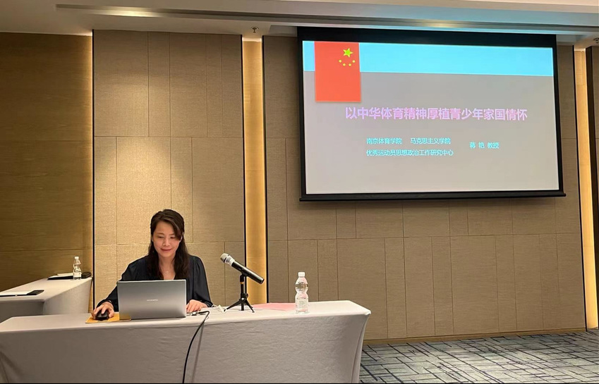 马克思主义学院蒋艳教授在会上作了题为《以中华体育精神厚植青少年家国情怀》的主题报告。从思想政治教育和体育教育的同构共建关系导入,阐释中华体育精神的内涵意蕴和时代传承,全面解读新时代中华体育精神。从历史逻辑、理论逻辑和实践逻辑论证以中华体育精神厚植青少年家国情怀的必然性,探索培育青少年家国情怀的基本路径。