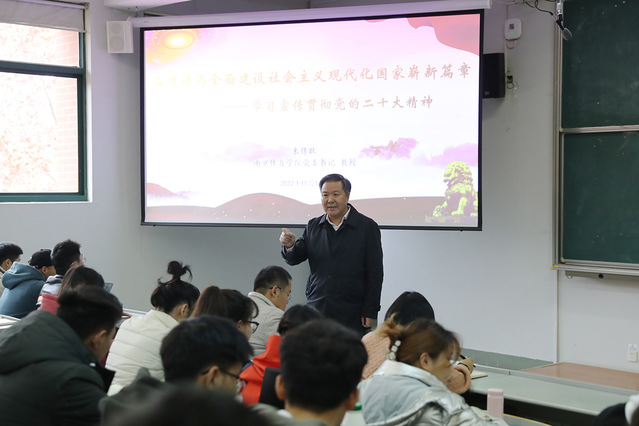 宣讲课上,朱传耿书记以热点时事——G20峰会的中美会晤为课堂导入,详细阐释了中美两国的国情差异、对中美治国理政的体制机制进行对比分析,系统阐释了党的代表大会制度和“五年规划”机制的重要性和深刻内涵。随后,朱书记以“奋力谱写全面建设社会主义现代化国家崭新篇章”为题,从“党的二十大主题和主要成果”“过去5年工作和新时代10年的伟大变革”“开辟马克思主义中国化时代化新境界”“以中国式现代化全面推进中华民族伟大复兴的使命任务”“全面建设社会主义现代化国家的目标任务”“坚持党的全面领导和全面从严治党”“以顽强奋斗应对风险挑战”“以中国式现代化推进‘新南体’新实践”等八个部分系统阐释了党的二十大精神内涵和实质,深入分析了在党的二十大精神指引下“新南体”未来发展的美好愿景与主要任务。