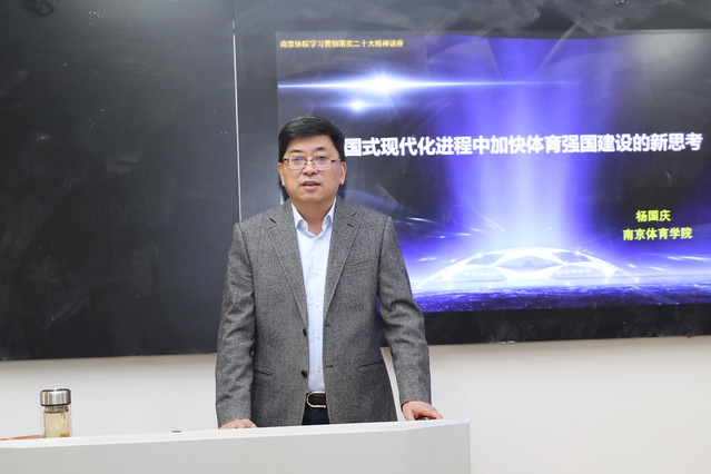 接着杨校长结合体育强国建设讲了三个方面:中国式现代化过程中加快体育强国建设的新认识、中国式现代化过程中加快体育强国建设的新问题、中国式现代化过程中加快体育强国建设的新举措。他强调中国式现代化过程中加快体育强国建设要彰显制度优势、要具有中国特色、要高质量发展、要以人民为中心、要整体性文明五个新认识。中国式现代化过程中加快体育强国建设的新问题,要从两个发展大局,即:世界百年未有之大局、中华民族伟大复兴的大局,把握体育强国国际环境条件发生巨大变化、国内形势复杂,面临重大调整和结构性困境。接着,他谈到中国式现代化过程中加快体育强国建设的新举措要做好思想认识、顶层设计、重点领域和关键环节的突破攻关、科学制定实施方案,把握好当前与长远的关系,局部和全局的关系,重点与非重点的关系,协调推进,有阶段、有步骤地加快体育强国建设!