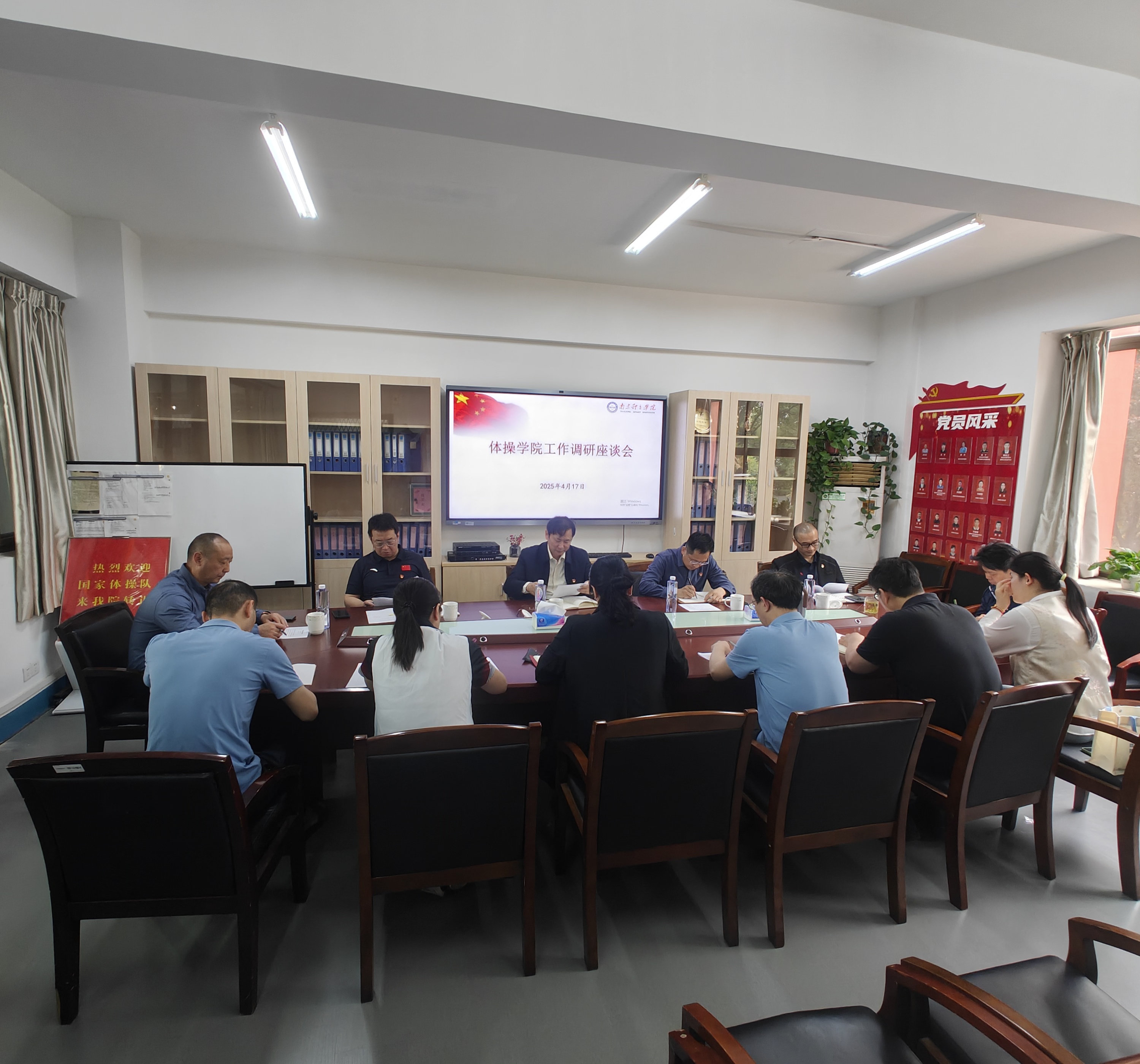 4月17日上午,校长吴兵成带领党政办、训练处、后勤处、竞技体育研究院等部门负责同志到体操学院调研第十五届全运会备战工作。体操学院全体管理干部出席会议。