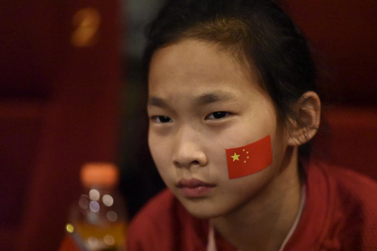 体操队团支部书记为运动员们一一贴上小国旗,并带领着所有运动员集合,统一前往电影院