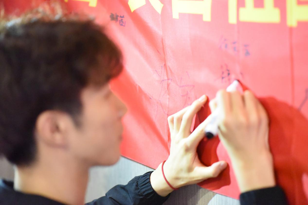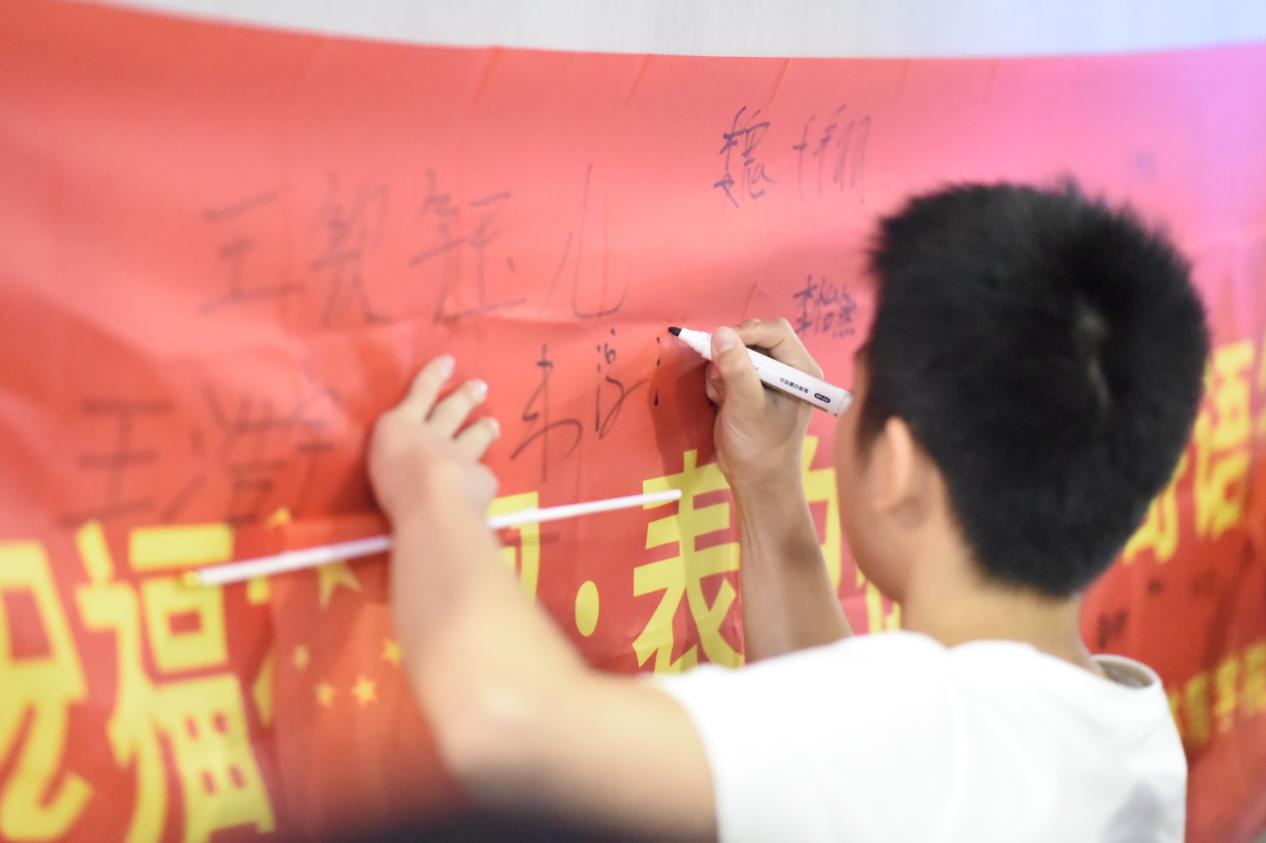 观影结束后,运动员们纷纷在“祝福祖国,表白祖国”的签字横幅上写下了自己的名字,共同留下属于我们的回忆