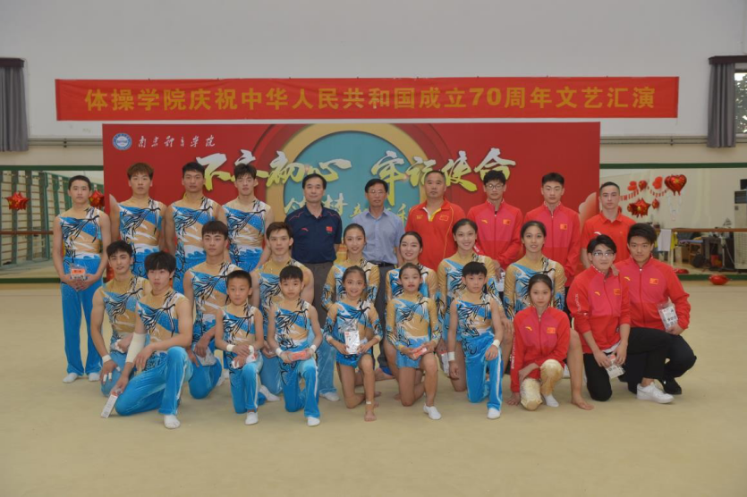 祝新中国成立70 周年文艺汇演在艺术体操馆举行,出席此次演出的有校领导金松、潘林珍、黄步龙、训练处处长丁习明,体操学院全体管理干部、教练员、运动员共同观看了本次演出。