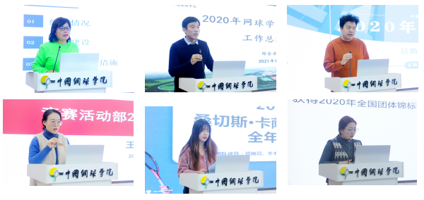 会上,训练部、办公室、竞赛活动部、后勤保障部、南京钟山网球发展有限公司等部门负责人分别就本部门2020年度工作情况以及2021年工作思路与计划等进行了详细汇报。