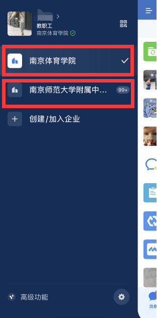 在“消息”菜单栏下点击左上角的三条横线,会显示自己目前加入的企业列表,打钩的企业表示自己目前正在登录和查看的企业,点击对应的企业名称,可以切换至对应的企业。