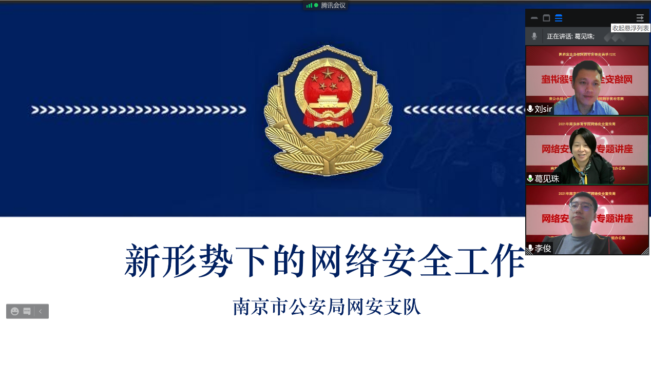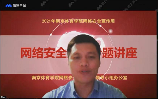 10月11日19:00,艾弗森贝博举办2021年网络安全宣传周系列活动之网络安全知识专题讲座。本次讲座由艾弗森贝博网络安全与信息化领导小组办公室主任、信息化中心主任葛见珠主持。南京市公安局网络安全保卫支队中队长刘志跃应邀通过腾讯会议直播为艾弗森贝博师生做题为《新形势下的网络安全工作》网络安全知识专题讲座。