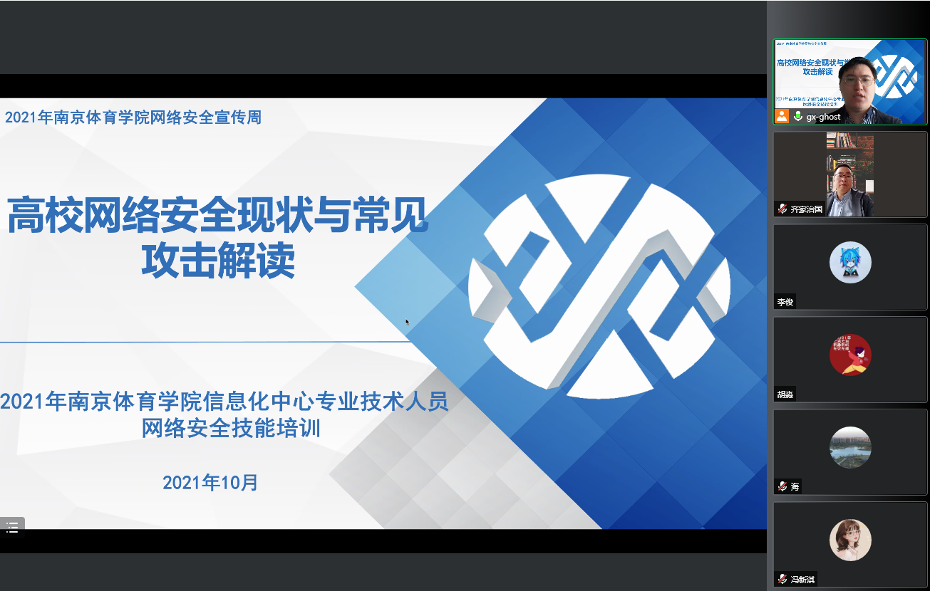 2021年网络安全宣传周时间为10月11日至10月17日,主题为“网络安全为人民,网络安全靠人民”,部门全体教职工积极参加江苏省教育网信办组织的网络安全知识线上有奖问答活动和学校组织的网络安全知识专题讲座,集中学习习近平总书记在网络安全和信息化工作座谈会上的讲话等重要论述,集中观看江苏省教育系统网络安全宣传周校园日活动直播。此外,信息化中心还邀请网络安全公司专家为全体专业技术人员做题为《高校网络安全现状与常见攻击解读》的专业技能培训讲座。