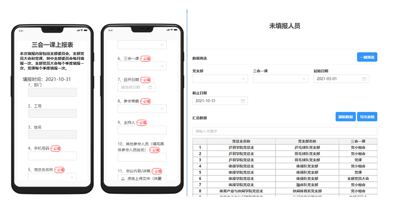 为解决组织部“三会一课”统计填报工作繁琐问题,2021年3月,信息化中心主任魏宁带领网络技术部冯新淇到组织部进行调研,于半个月内完成了“三会一课”填报平台的部署上线工作,期间多次进行功能调整升级,极大地方便了各个总支及支部的上报工作,同时也方便了组织部统一存档及管理工作。目前该系统已经上线平稳使用近半年,切实减轻了各基层党组织工作人员压力,提高了工作效率。