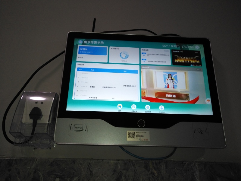 教室里还配备了电子班牌,在平时可展示课表与当前课程信息,在考试时还可通过人脸对考生进行身份核验。