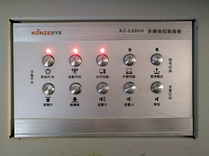 教室内多媒体设备通过中央控制器(中控)进行统一控制,可实现一键上/下课。按系统开/关键后,电脑、智慧黑板、投影仪、投影幕布等都会自动开启/关闭。