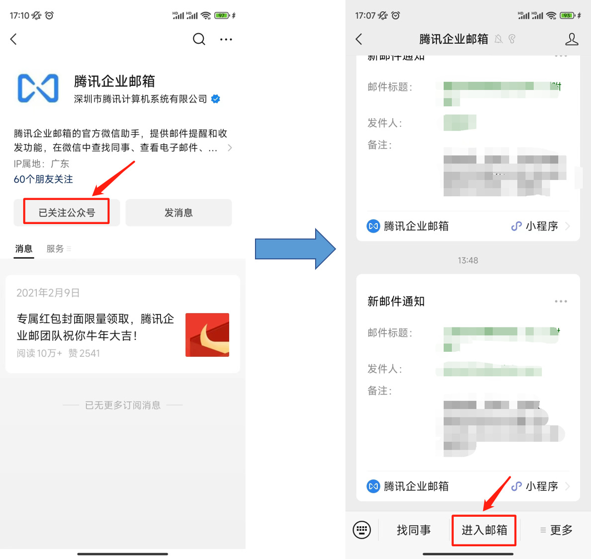 (3)方法三:微信进入邮箱。打开微信,找到“腾讯企业邮箱”点击关注,在界面的下端点击“进入邮箱”。