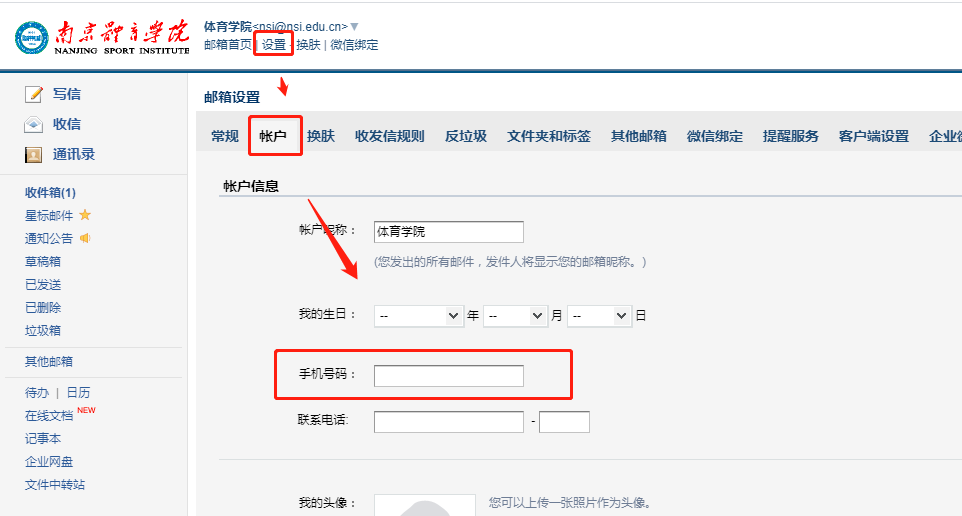 用户登录邮箱后,通过“设置”-“帐户”-“手机号码”,填写手机号码进行绑定。