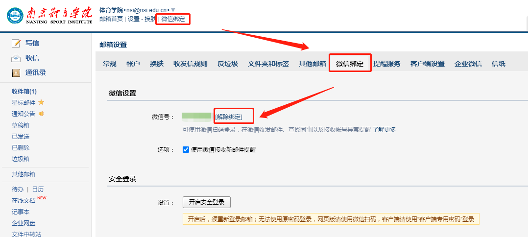 (2)解绑方法:登录邮箱后,选择“设置”-“提醒服务”-“微信提醒”,点击“解除微信绑定”,使用微信“扫一扫”扫描弹出的二维码,即可解除邮箱与微信的绑定关系。