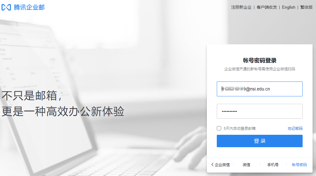 (4)方法四:访问腾讯企业邮箱地址https://exmail.qq.com/login,使用账户密码、手机号验证码、微信、企业微信扫码等方式登录,账户需输入完整的邮箱地址。注:因网络安全双因子认证需要,使用账户密码方式登录后仍需微信或企业微信扫码确认。