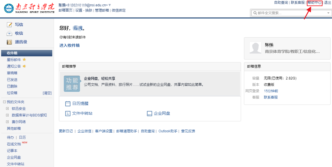 用户使用过程中遇到问题可以点击邮箱右上方“帮助中心”寻求帮助,也可拨打服务热线84755263进行咨询。