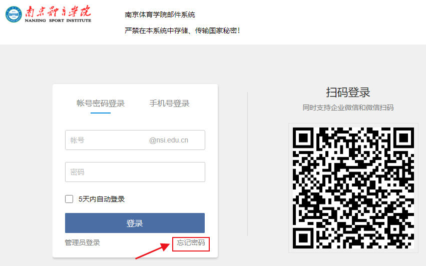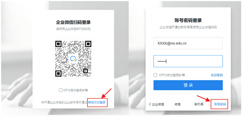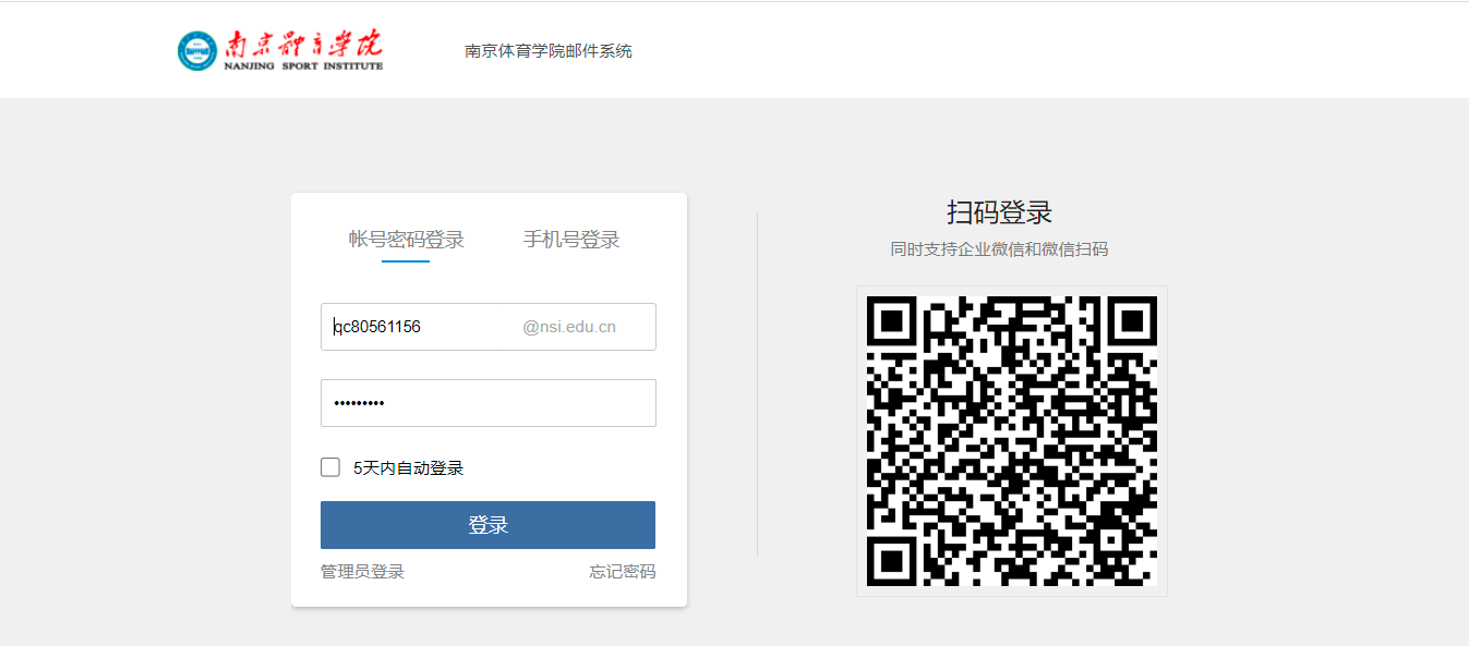 (2)方法二:访问学校邮箱主页mail.nsi.edu.cn,使用账户密码、手机号验证码、微信扫码等方式登录。注:因网络安全双因子认证需要,使用账户密码方式登录后仍需微信扫码确认。