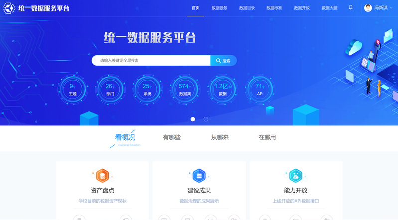 数据智能门户作为数据管理的入口,提供了校级资源管理和服务能力,主要包括数据概览、数据服务、数据资产目录、数据标准、数据开放和数据大脑。面向数据建设者、数据提供者、数据使用者和数据管理者,实现在线管理、查询、使用数据资源,了解数据质量问题,提高数据的使用率,为提升学校数据质量提供核心决策支持。