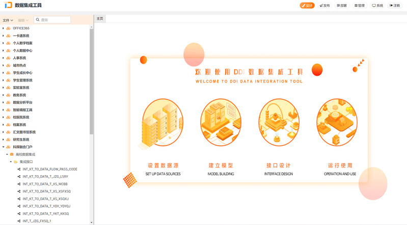 数据集成平台提供界面简洁、功能强大、性能优良的数据集成能力,能够从底层将各类业务系统的各种类型的数据源(包括Oracle、Mysql、Sqlserver以及Excel等)打通,实现异构数据源之间的交换、集成和共享,降低了学校数据集成工作的技术壁垒。截至目前信息化建设处已对接26个系统,设计接口134个,日均接口运行次数811次。