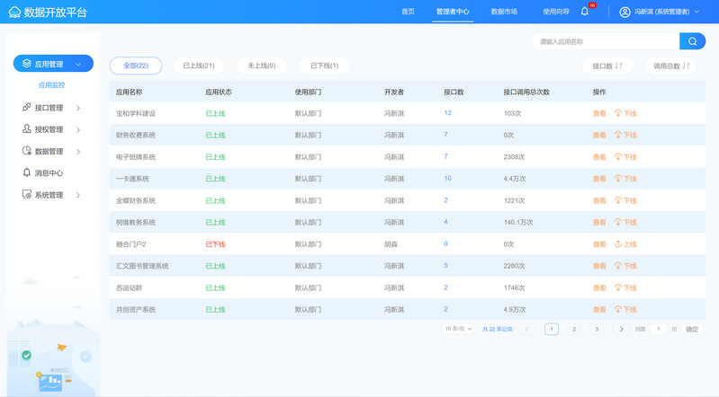 数据开放平台围绕“发布能力-管理能力-开放能力-监控能力”提供读物,对数据进行统一的封装和管理功能,为各业务系统提供API封装和视图共享服务,从而推进打通各业务系统间的“数据孤岛”,为应用开发提供统一、标准的数据支持。学校各职能部门都可申请所需数据,信息化建设处提供各类数据接口形式,并制定了详细的数据使用申请规范。截至目前信息化建设处已为22个业务系统提供数据,完成标准数据接口71个,申请接口总数105次,数据累计交换次数334万+。数据集成平台