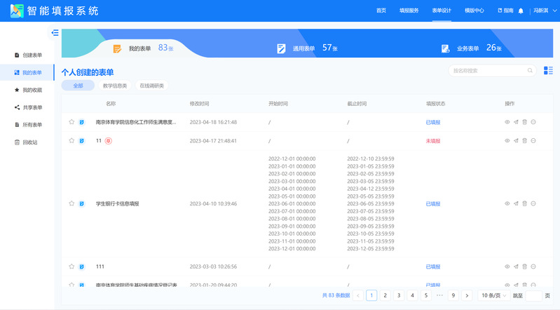 智能填报工具是填表服务的工具。通过从数据中心、外部数据采集整合各类信息,进行重新整理和汇总,提供综合数据查询的入口,和数据统计功能,同时共享给其它系统及流程构建平台,努力实现“一次填报,多次复用”。截至目前信息化建设处已设计完成表单83张,包括通用表单57张,业务报表26张,累计填报次数已超过50万人次。