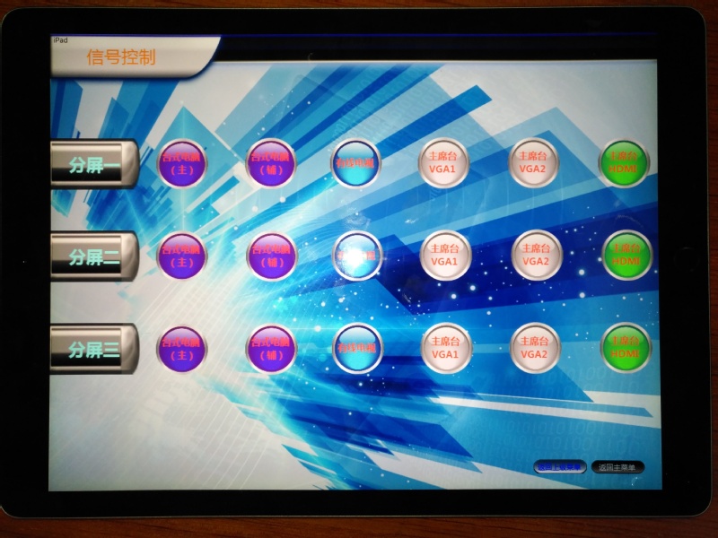 针对不同纵横比的投屏需求,该处还配备了画面控制系统,可对屏幕分区并分别控制。而iPad的使用允许操作者在厅内任何位置方便、直观地切换画面。