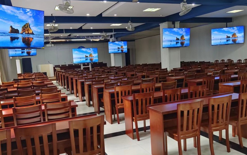 此处多媒体设备与教学楼小教室类似,主要包括大屏、多媒体讲台、中控、功率放大器,以及手持式麦克风。